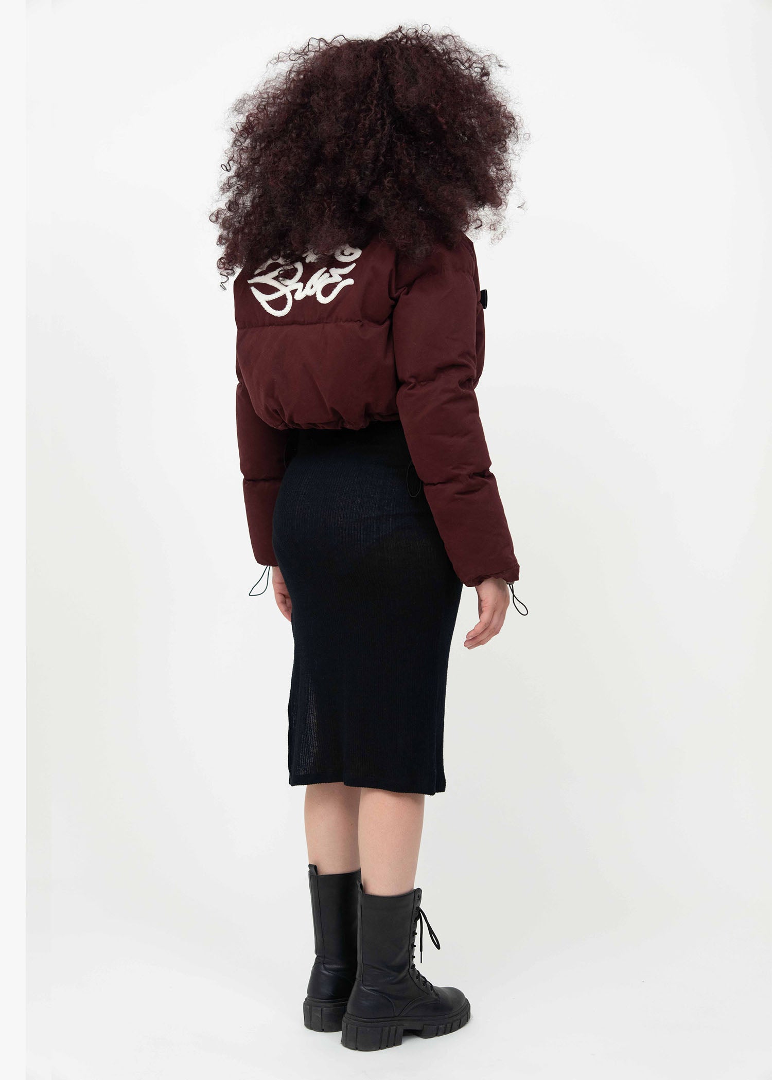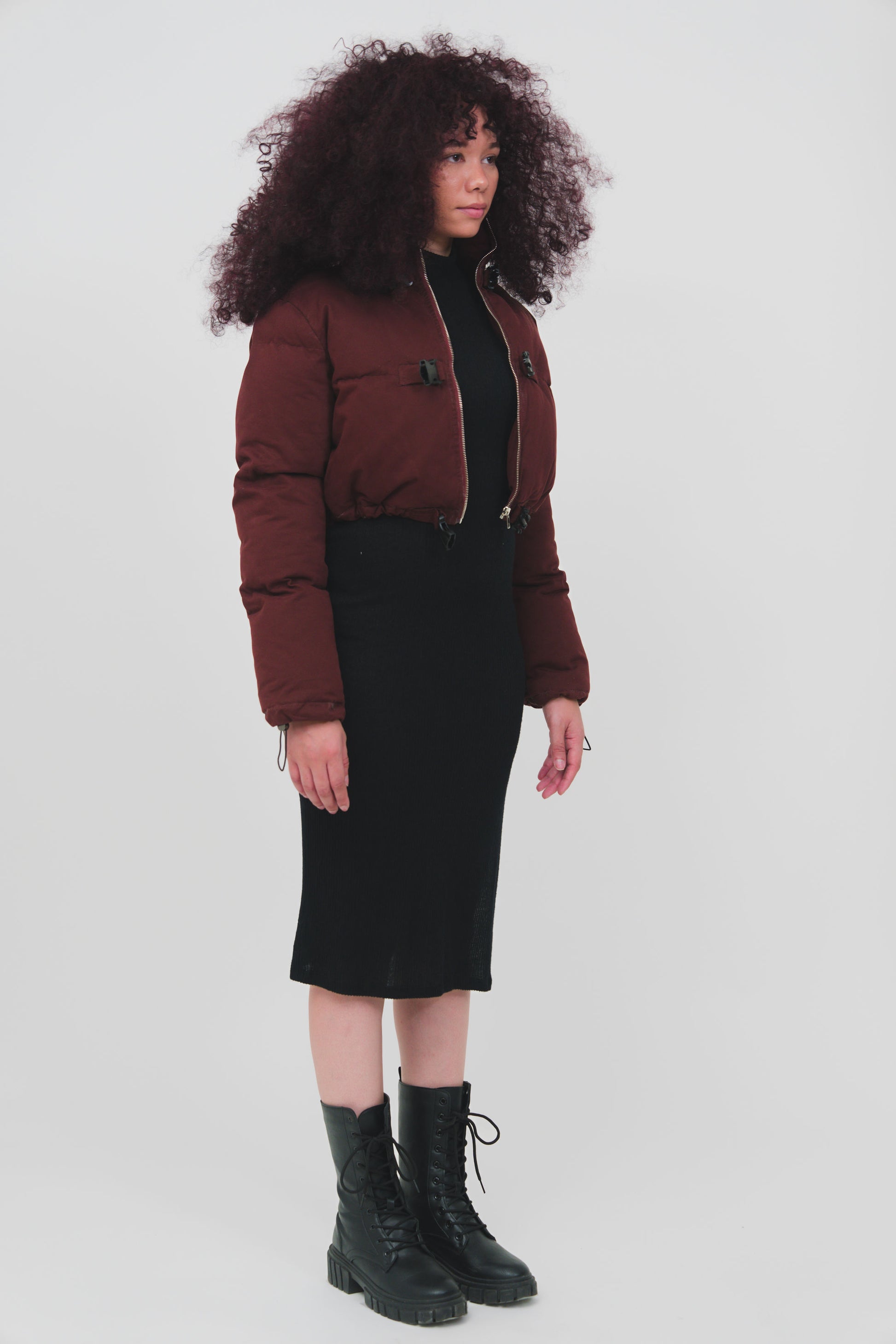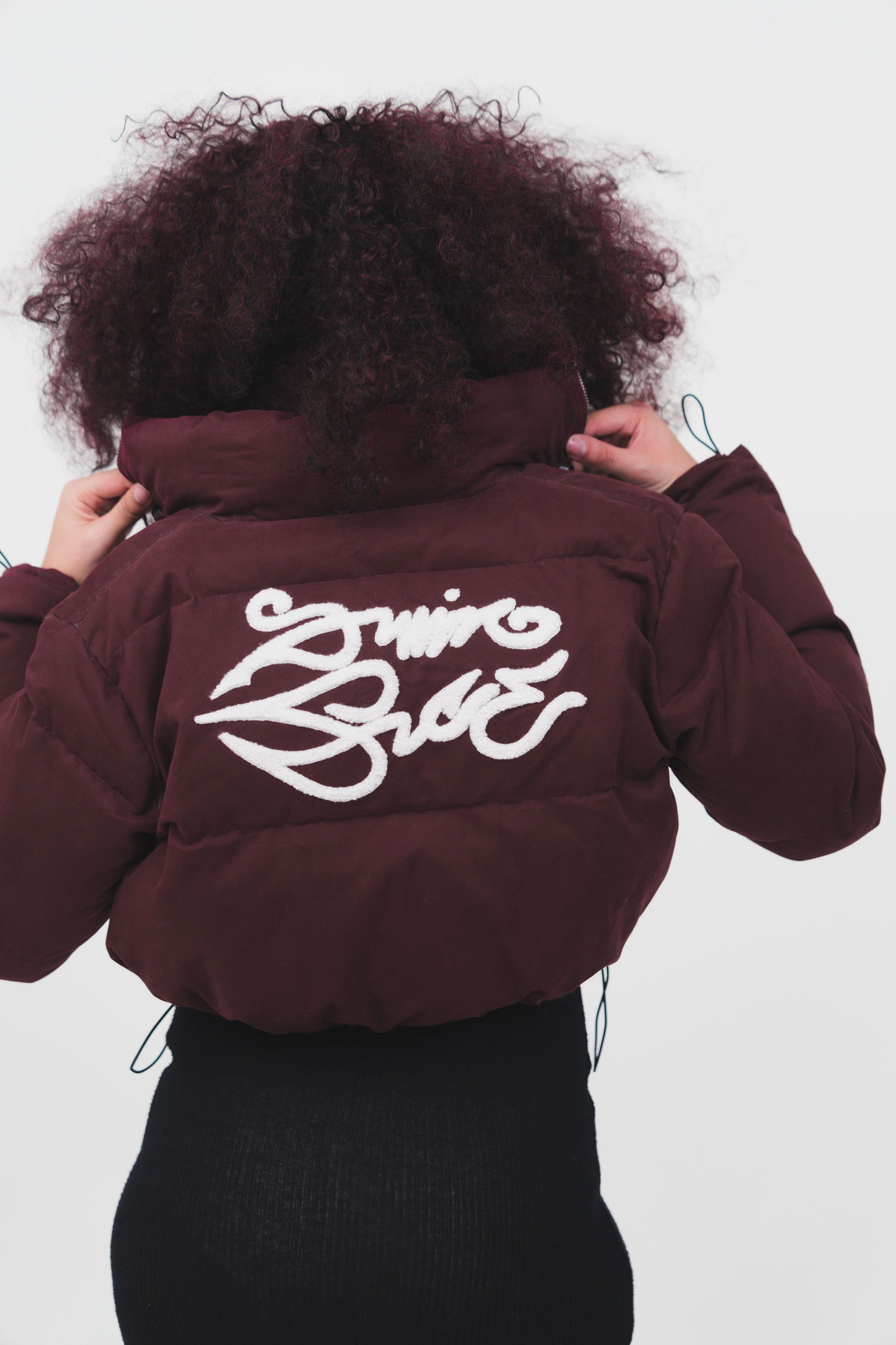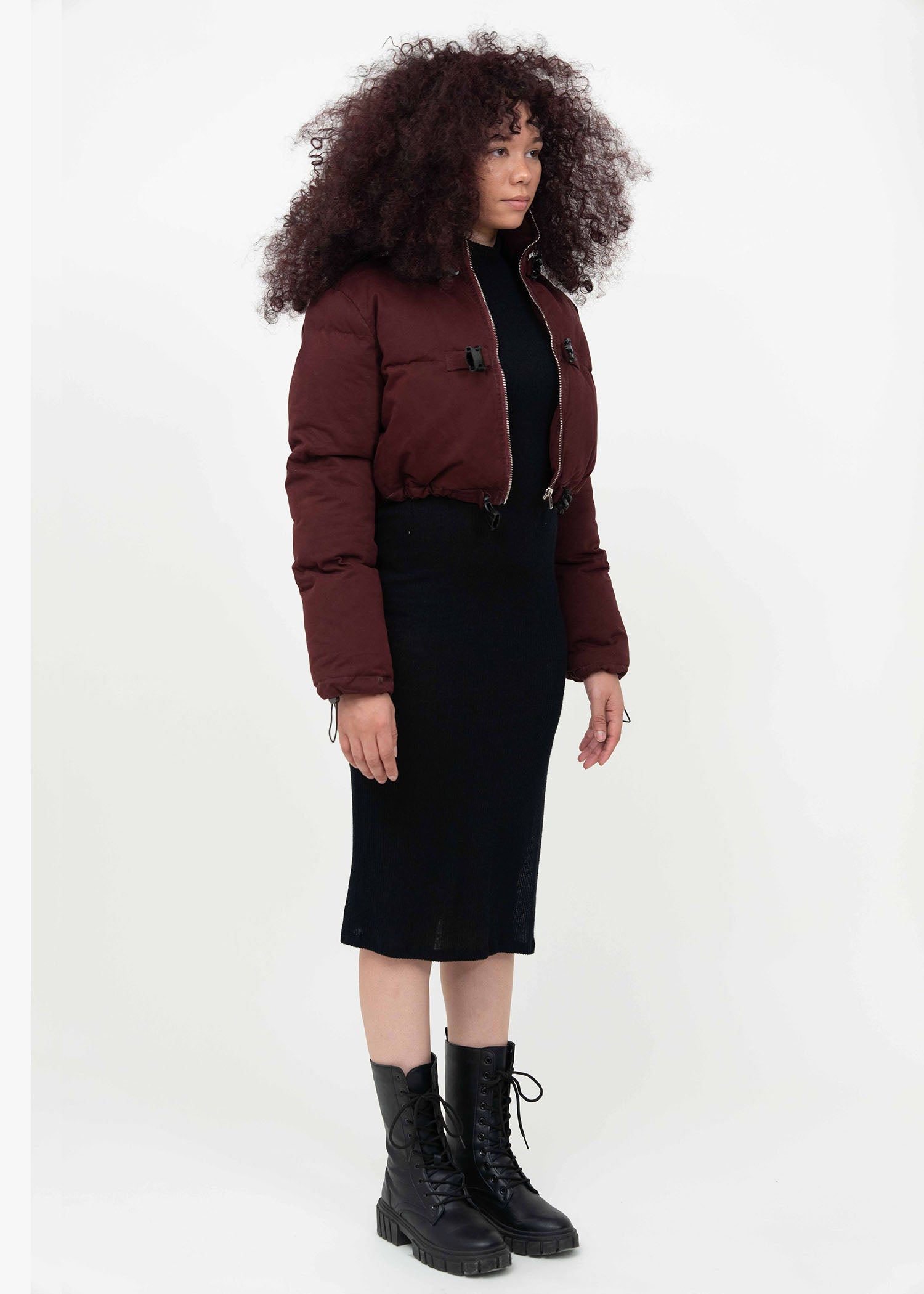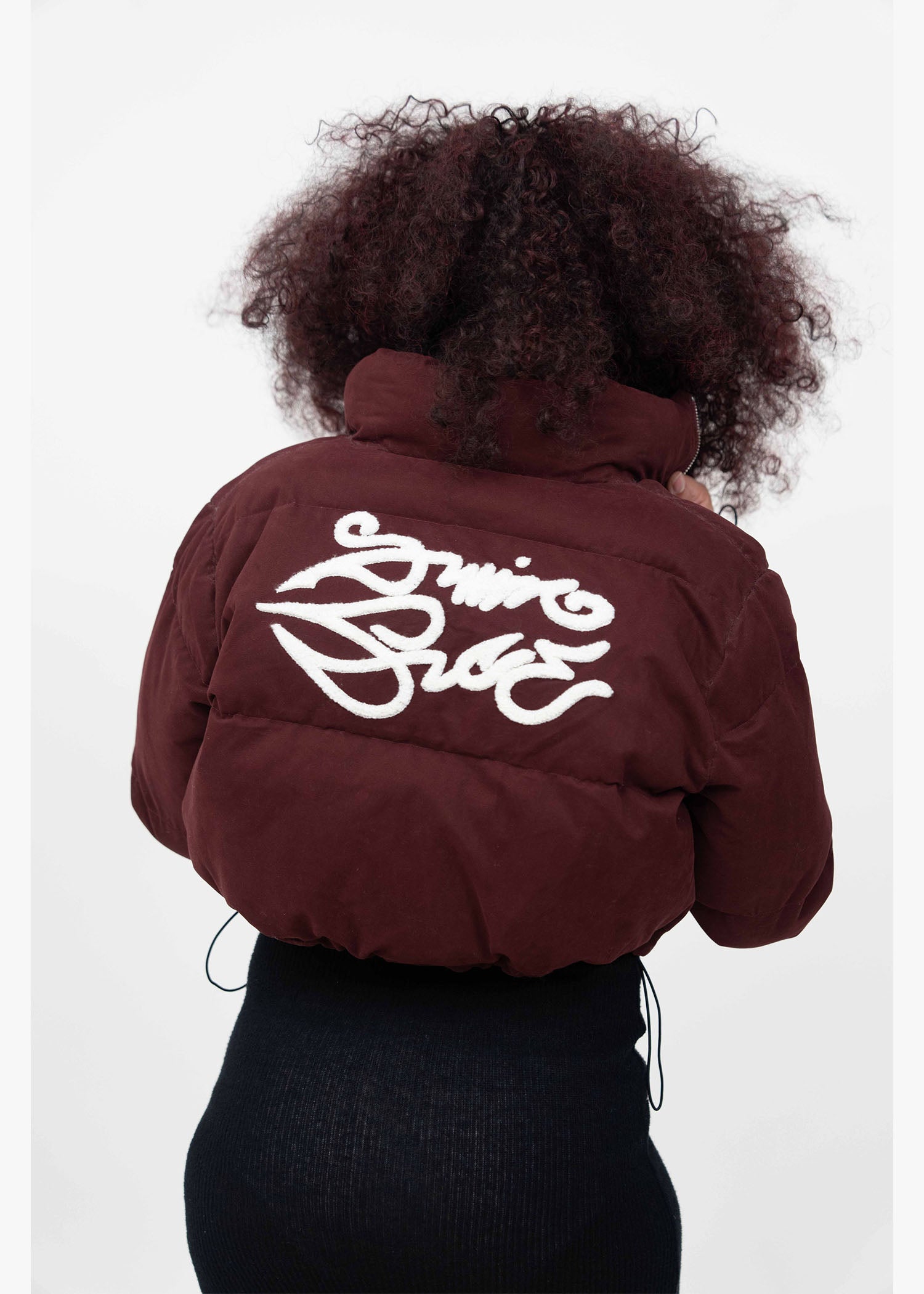 Super warm, Super comfy; Our Racer Cropped Puffer is made with 100% Cotton, 100% Cotton stuffing and a silky nylon lining. Adjustable wrists and waist cinch.