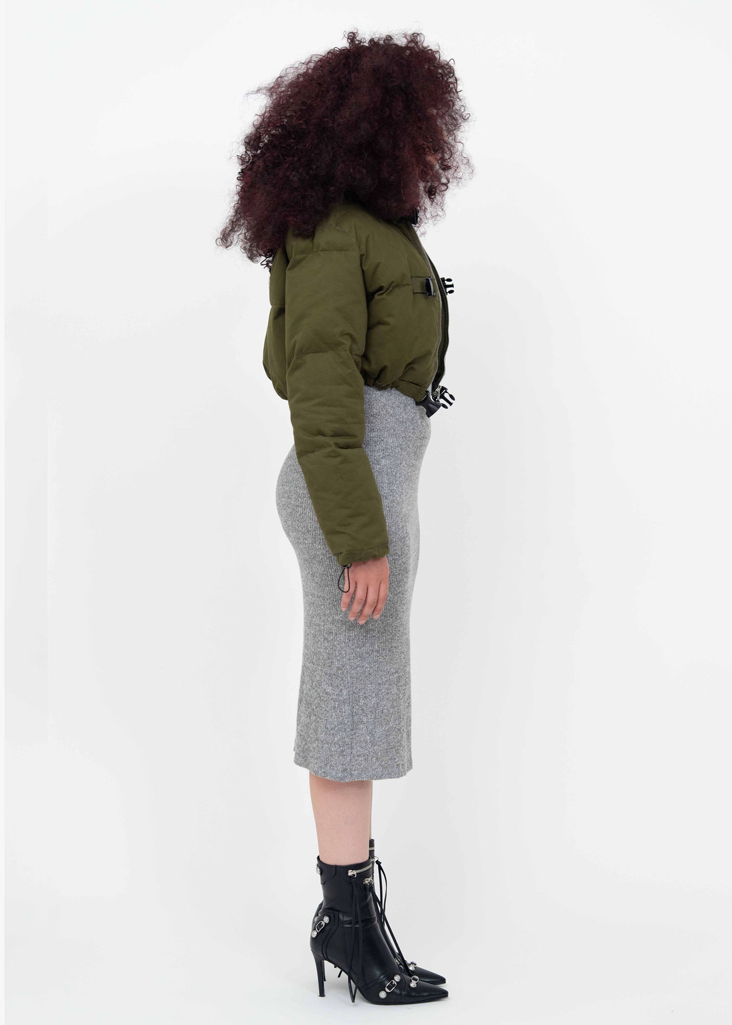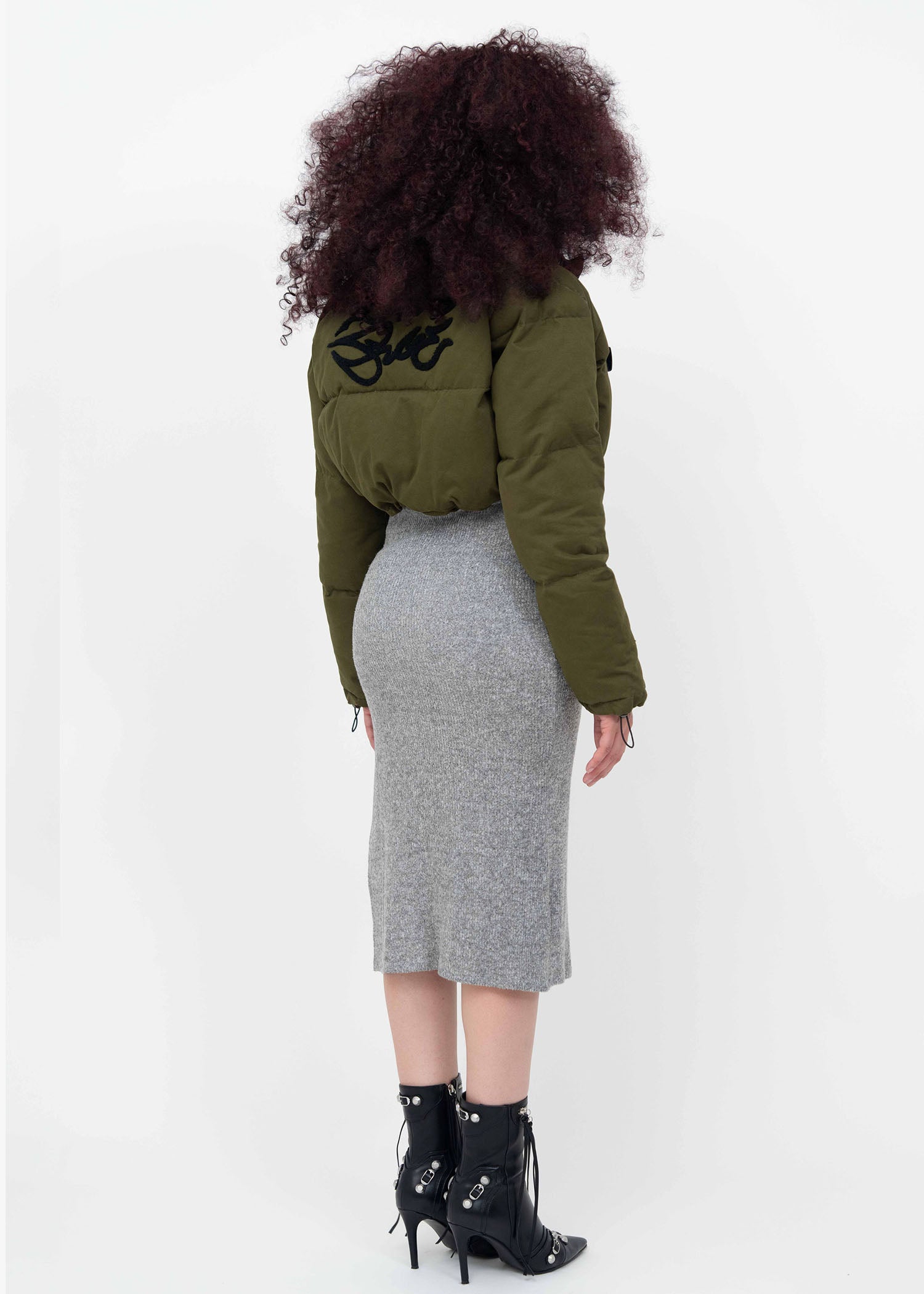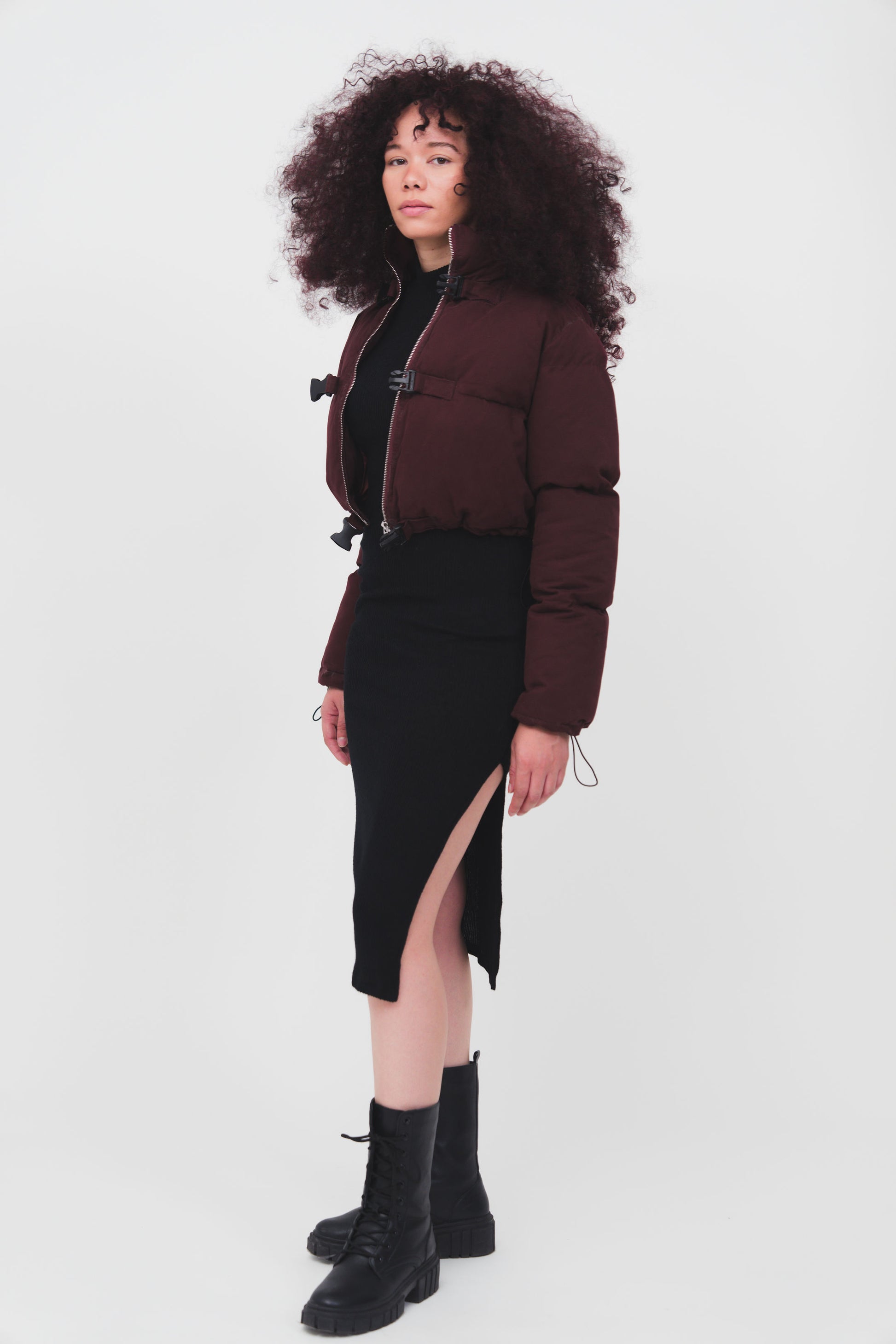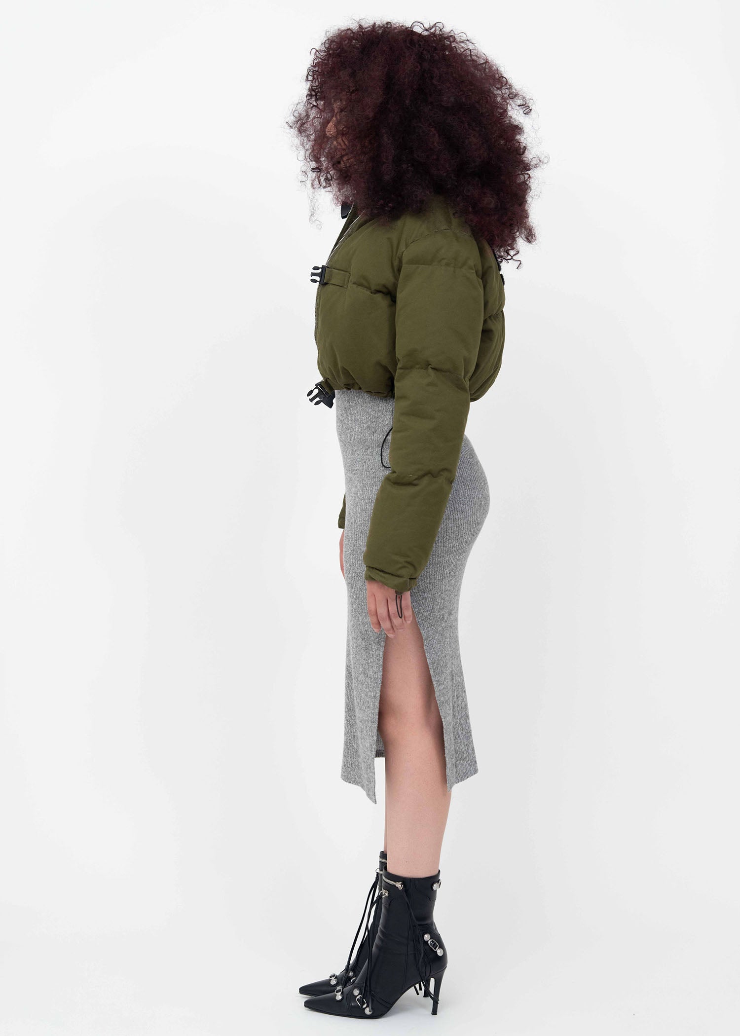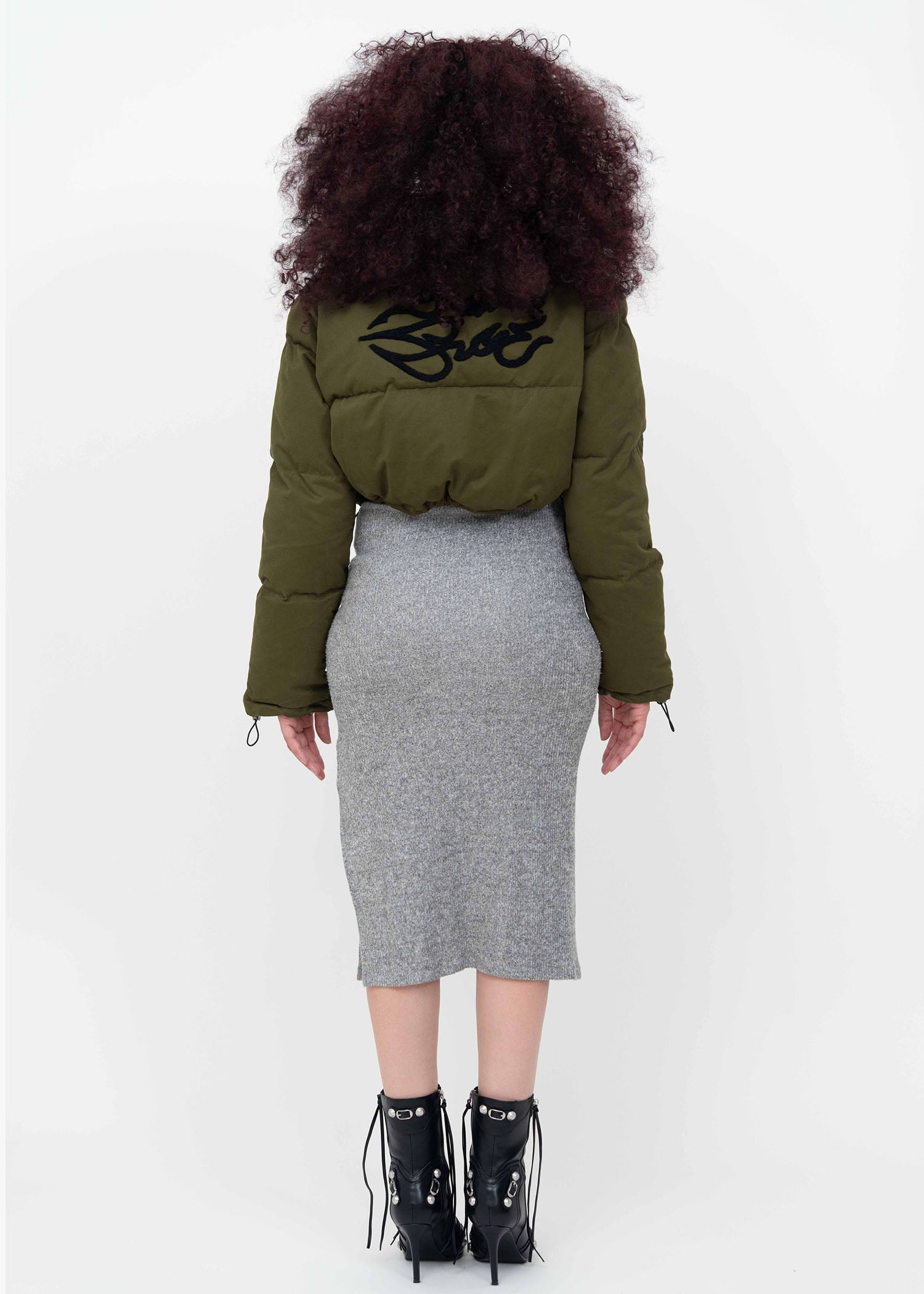Super warm, Super comfy; Our Racer Cropped Puffer is made with 100% Cotton, 100% Cotton stuffing and a silky nylon lining. Adjustable wrists and waist cinch.